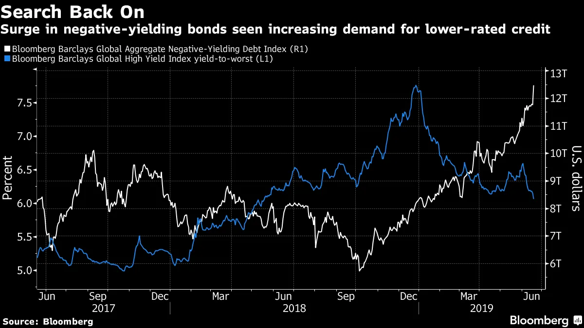 由于马里奥·德拉吉发出了更大货币宽松可能即将到来的最明确信号,全球负收益债务的储备已超过12万亿美元。欧洲中央银行行长在葡萄牙辛特拉的评论,首次推动法国10年期收益率降至零,而瑞典和奥地利的基准收益率则转为负值。根据富国银行投资研究所的说法,这些变化可能会刺激对垃圾债券的需求。