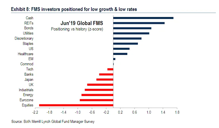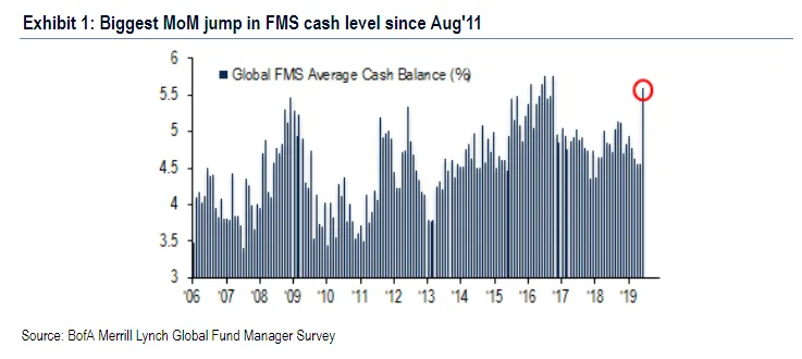 与这一分析直接相关的是美国银行最新的全球基金经理月度调查。它通常被视为逆向指标,这在此时是件好事,因为调查发现,基金经理现在的悲观情绪与十年前金融危机最严重时一样。这是现金水平的变化,通常是消极情绪的明显迹象: