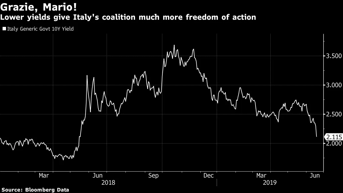 那么,为什么债券市场仍然持续设定异常低的收益率?周二的答案是欧洲中央银行行长马里奥·德拉吉在辛特拉发表的非常鸽派的演讲。随着降息和更多资产购买再次被提上日程,全球债券收益率创下新低。德拉吉显然试图避免的问题是,中央银行家的这种承诺可以作为“保护性期权”来保护政治家。这并不是他在欧洲央行任期内第一次等待政治家的财政刺激而未果,然后不得不勉强采取主动。在意大利的情况下,其民粹主义联合政府正因其赤字支出计划与欧元区接近冲突,辛特拉的演讲似乎拯救了一些非常可疑的政治行为: