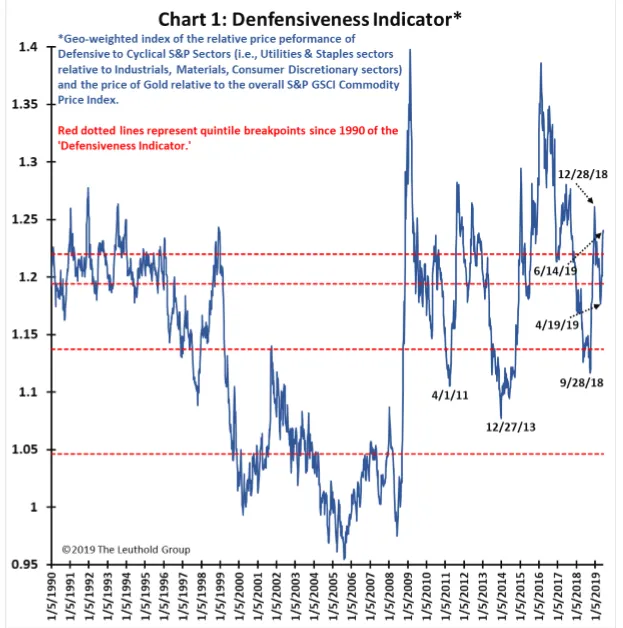 正如我昨天指出的,市场内部数据显示,相对防御性的股票如公用事业表现优于更具周期性的产品。在周二,我从Leuthold Group的策略师詹姆斯·保尔森那里得到了更复杂的说明:
