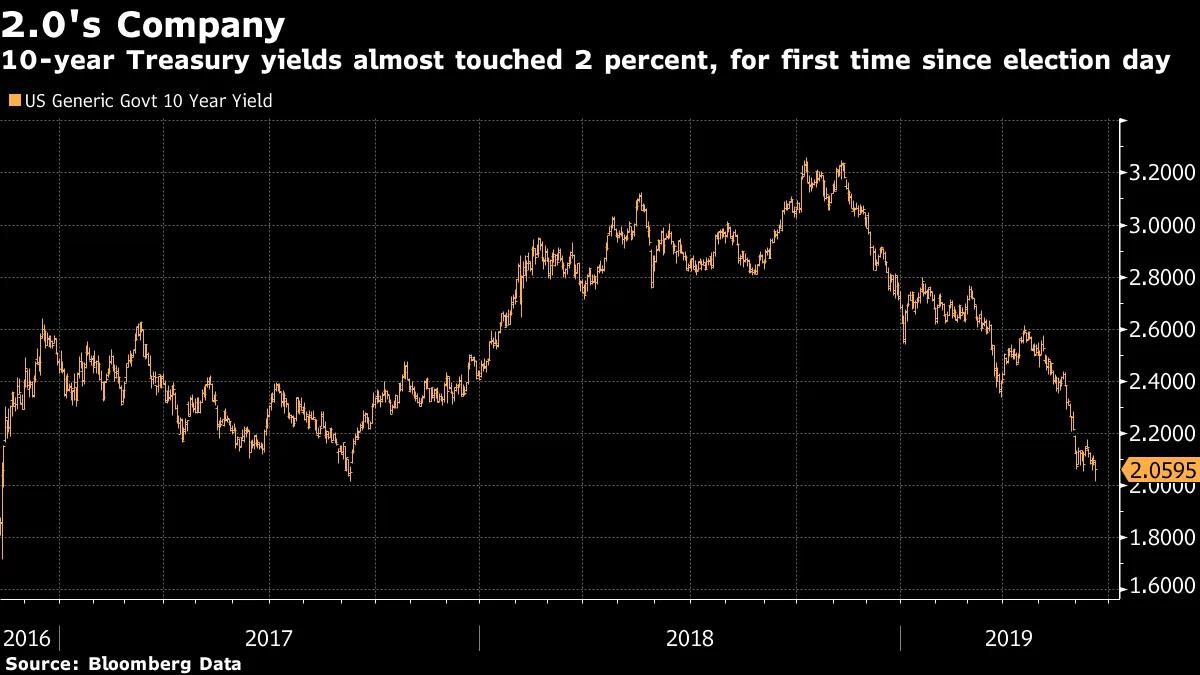 从债券收益率的下降和黄金价格的上涨可以明显看出,投资者感到焦虑。与此同时,至关重要的10年期美国国债收益率在周二进一步下跌,降至2.02%。这几乎是自特朗普当选后收益率飙升以来,收益率接近跌破2%水平的程度: