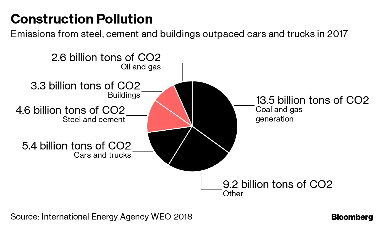 **建筑是主要的污染源。**像伦敦的碎片大厦和纽约的自由塔这样的建筑不仅消耗大量能源,而且制造这些建筑所用的材料会产生大量二氧化碳。根据C40报告,建筑业负责11%的全球碳排放,政策制定者正在关注这一问题。这促使像蒂森克虏伯和拉法基霍尔西姆这样的钢铁制造商和水泥供应商寻找更环保的替代方案。