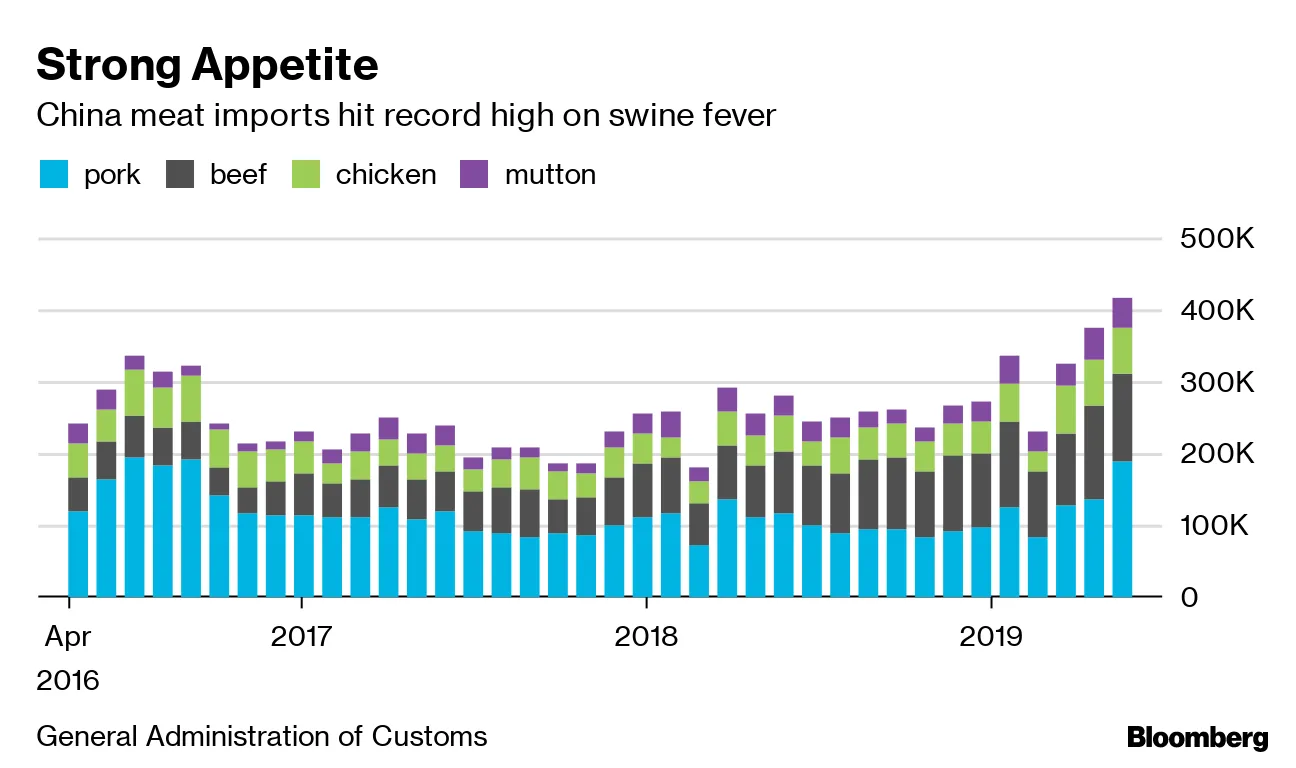 中国在5月进口了创纪录的肉类,以期减轻非洲猪瘟的影响,因为国内猪肉价格反弹。根据官方数据,全球最大的猪肉消费国在5月购买了556,276吨肉类和内脏,比去年同期增长约45%。这使得前五个月的总进口量达到220万吨,比去年增长23%。