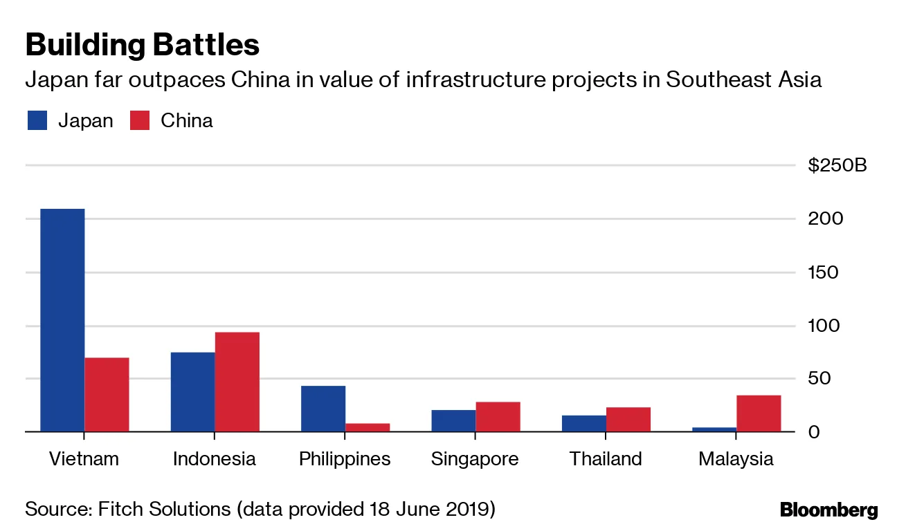 - 但中国在与日本争夺东南亚基础设施建设的竞争中处于劣势,得到日本支持的项目在该地区六大经济体中的价值为3670亿美元,而中国为2550亿美元。