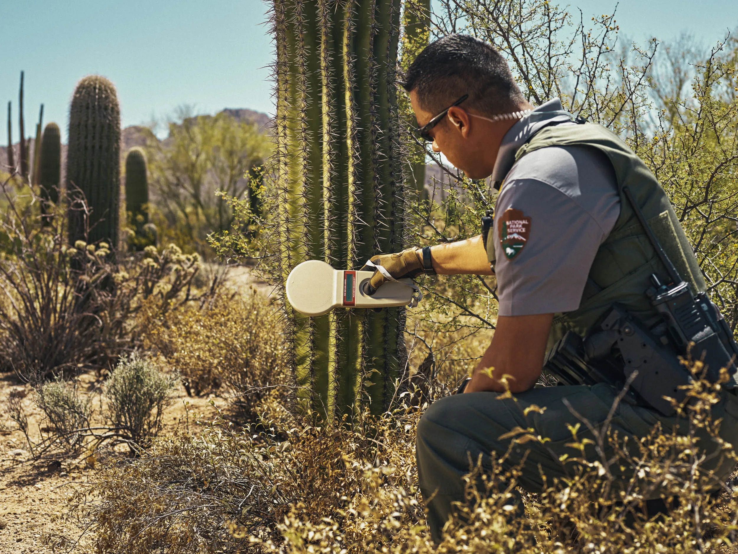 公园管理员塞缪尔·阿恩伯格在萨瓜罗国家公园读取RFID芯片。摄影师:Balazs Gardi为《彭博商业周刊》拍摄在三月,Pero对住在犯罪现场附近一栋破旧小屋里的休斯执行了搜查令。Pero和他的同事在一个围栏旁发现了一堆红木,还有藏在防水布下的红木板。更多的木材散落在一个小工作坊周围。总的来说,Pero和他的团队移除了32块木材。经过检查,一名公园管理员告诉法官,这些木材可能与梅溪现场的树木相匹配。