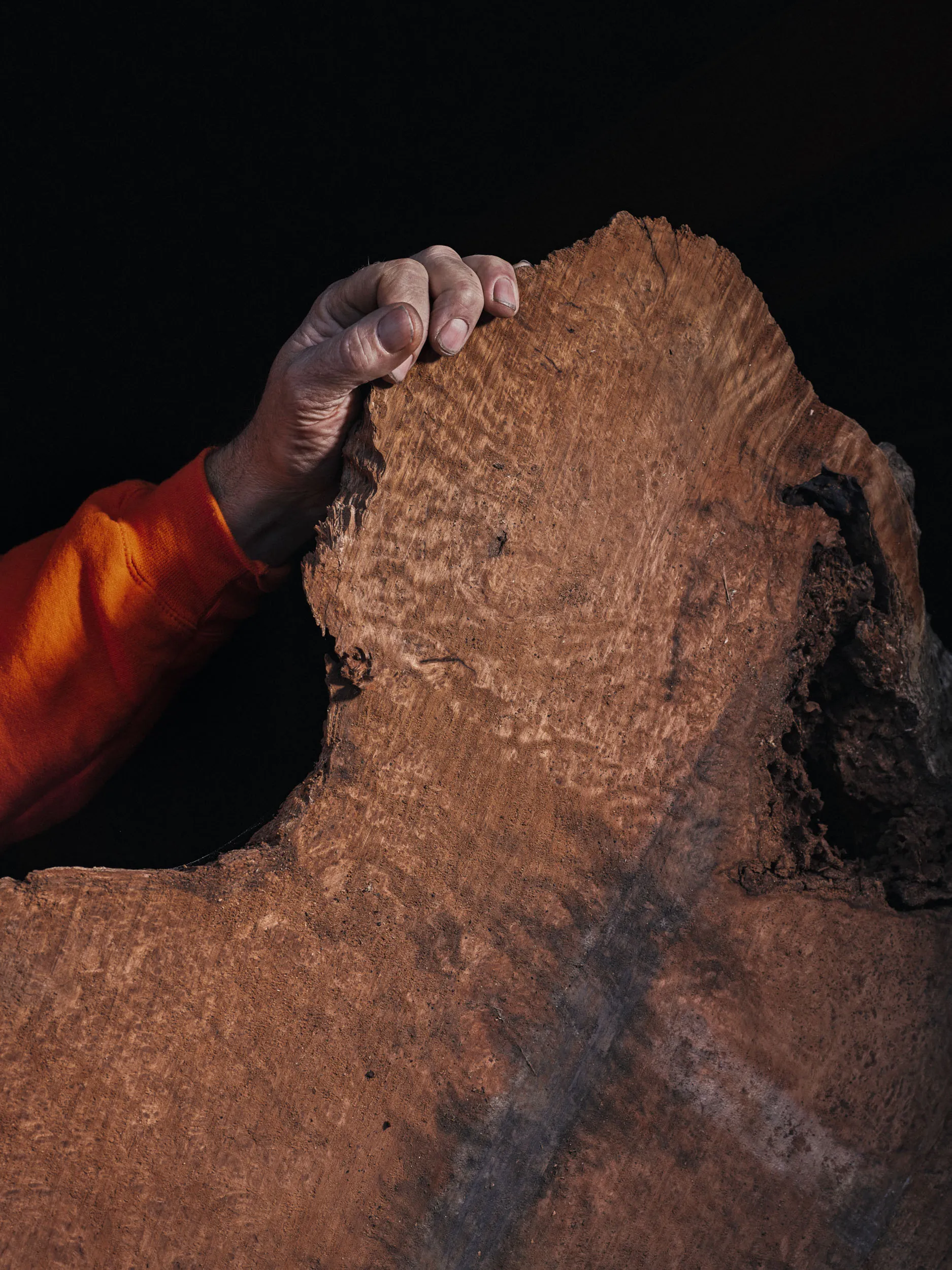在商业熔炼捕鱼和担任当地志愿消防队队长之间,詹姆斯·西蒙斯在101号公路东侧的小镇奥里克经营着 Wagon Wheel Burl。在他商店后面的一个小屋里,他打开一扇门,展示他个人收藏的树瘤木片,其中一块直径约4英尺,形状特别优美,图案让人联想到老虎的条纹外套。去年,一位业余爱好者出价500美元想买下它,用作台球杆的镶嵌;西蒙斯坦言,当顾客决定选择另一块时,他感到很高兴,这让他得以保留这块木片。