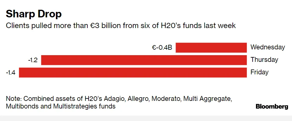 H2O危机加深。 客户 在上周短短三天内从六个资产管理公司的基金中撤回了超过30亿欧元,原因是对与德国金融家拉尔斯·温多斯特相关的流动性不足的持有资产的担忧。他们仅在周五就损失了超过14亿欧元。这对一家在某些基金中年回报率超过20%的公司来说是一个突然的逆转。母公司Natixis的股票再次下跌。