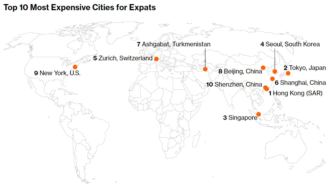 香港被评为 全球 外籍人士最昂贵的城市,连续第二年,得益于其火热的房地产市场和其与美元挂钩的货币波动。苏黎世是排名第五的首个非亚洲城市。瑞士的其他城市分别位列第12和第13,而伦敦则下滑四位,排名第23。