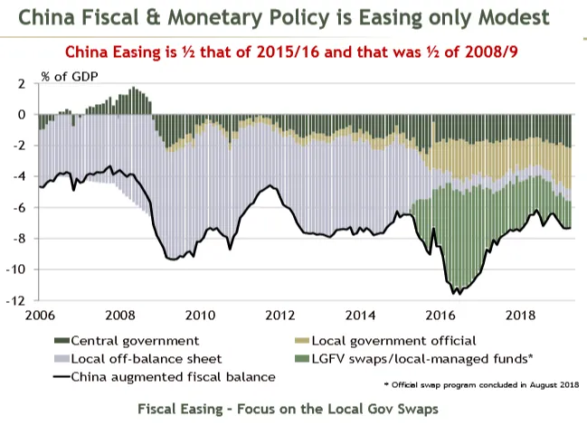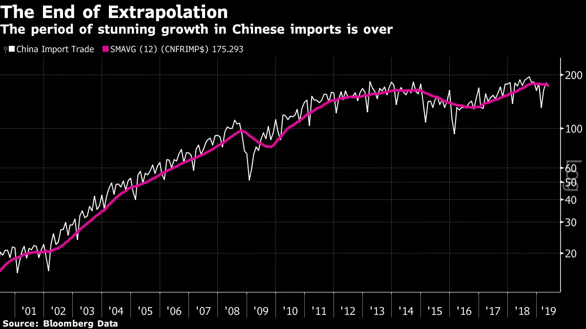 该图表显示了12个月的移动平均线,以平滑中国春节期间年度停工的影响。正如马格努斯所说,外推的时代已经结束,最近的进口趋势略有下降。过去12个月的贸易摩擦在边际上与此有一点关系,但最重要的因素无疑是中国的基本经济需求。这种需求已经持续疲软,并且越来越依赖信贷来刺激增长。2015年中国经济惊人放缓后,这一点得到了强调,导致全球市场出现严重调整,随后在大规模信贷扩张后稳定下来。