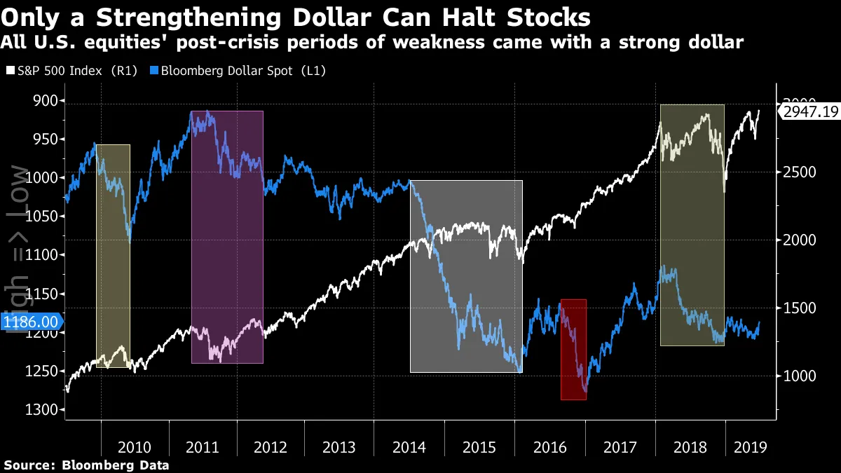 还有一个对特朗普来说最重要的指标,那就是美国股市。在危机后的十年中,所有相对疲软的时期都发生在美元强势时期。当美元贬值或保持稳定时,标准普尔500指数就会飙升。下图显示了所有美元强势的时期,布隆伯格美元现货指数的线条为清晰起见进行了反转。