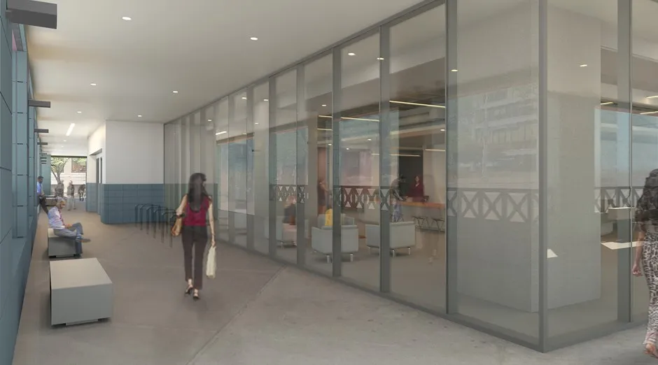 翻新后建筑的效果图,新的铝制外覆层和清玻璃取代了原有的深色玻璃。由 DLR Group 提供波特兰大楼的深色窗户与奶油色外立面油漆形成对比,现已被清玻璃取代,以增加室内自然光。其一楼的走廊,原本用于零售,现在将成为大堂的一部分,玻璃封闭以增加光线。