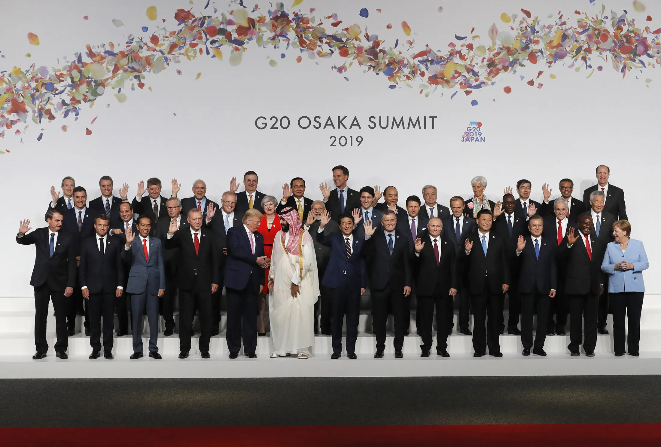 美国总统唐纳德·特朗普,前排第五左,正在与沙特阿拉伯王储穆罕默德·本·萨勒曼,前排第六左,交谈,巴西总统贾伊尔·博索纳罗,前排左起,法国总统埃马纽埃尔·马克龙,印度尼西亚总统佐科·维多多,土耳其总统雷杰普·塔伊普·埃尔多安,日本首相安倍晋三,阿根廷总统毛里西奥·马克里,俄罗斯总统弗拉基米尔·普京,中国总统习近平,韩国总统文在寅,南非总统西里尔·拉马福萨,德国总理安格拉·默克尔,西班牙首相佩德罗·桑切斯,第二排左起,埃及总统阿卜杜勒·法塔赫·西西,欧洲委员会主席让-克劳德·容克,澳大利亚总理斯科特·莫里森,英国首相特蕾莎·梅,印度总理纳伦德拉·莫迪,加拿大总理贾斯廷·特鲁多,意大利总理朱塞佩·孔特,欧盟(EU)主席唐纳德·图斯克,塞内加尔总统马克·萨尔,智利总统塞巴斯蒂安·皮涅拉,新加坡总理李显龙,以及其他世界领导人和代表在2019年6月28日星期五于日本大阪举行的二十国集团(G-20)峰会上合影留念。世界上最强大的领导人齐聚日本,举行会议,可能为全球经济设定方向,并在地缘政治热点之间决定战争与和平的差异。摄影师:金京勋/彭博经济摄影师:金京勋/彭博经济