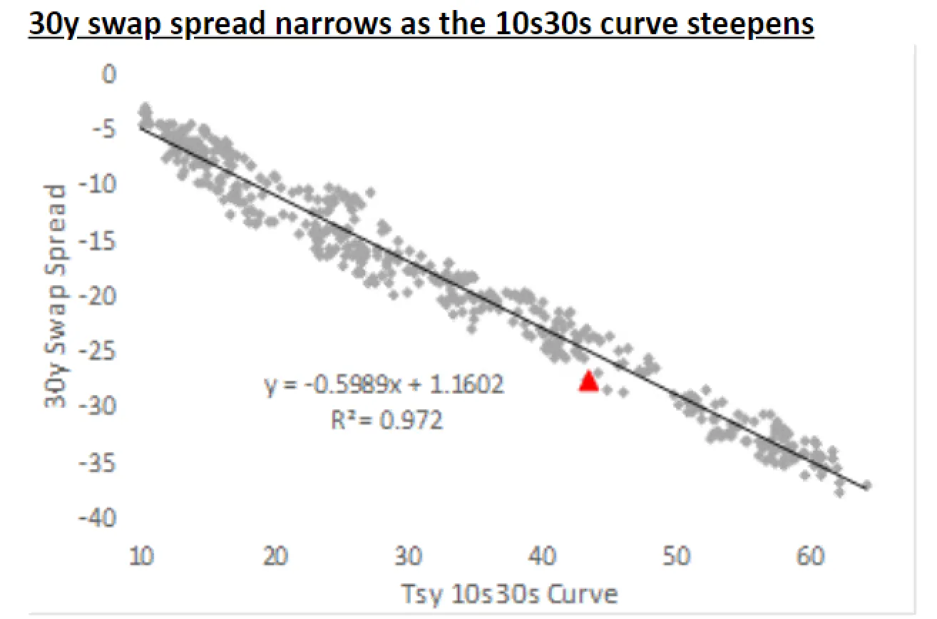 “这在30年期掉期利差与10年和30年期曲线之间的强相关性中表现得很明显,”Rajappa写道。“此外,避险资金流动往往更青睐5年和10年期国债,而非30年期国债,这也促成了5年和30年期曲线的陡峭化。”