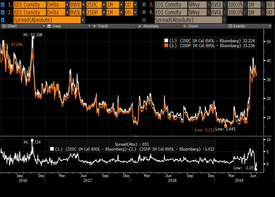 八月份的看跌期权未平仓合约在过去几天逐渐上升,这表明交易员们在寻找保护,以防美联储在七月会议上不采取任何行动。而前一个月的欧元美元合约的期权,从一个极端(由于投资者押注于降息,认购期权的隐含波动率远高于认沽期权)转向了另一个极端。