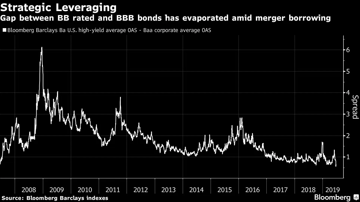 谈到信贷中的自满情绪时,常常会提到BBB(投资级别中最差)和BB(垃圾债中最好)之间的利差缩小,这一利差已缩小至周期低点。