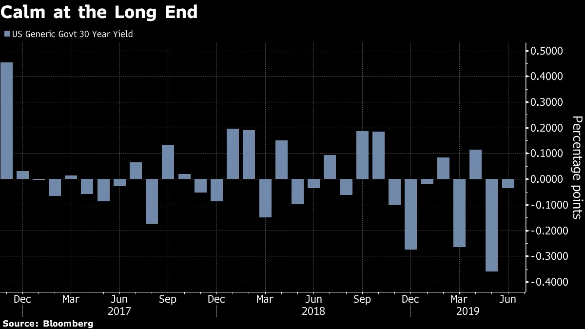 所有这些使得30年期国债本月未能实现重大上涨显得尤为引人注目。两年期票据、五年期和十年期债券在六月都经历了两位数的收益率下降。
