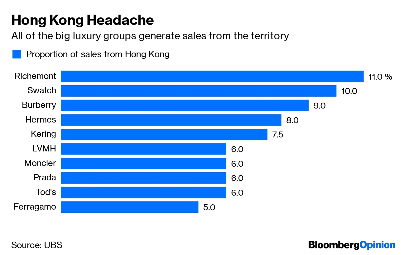 - 这场动乱可能会对包括瑞士历峰、巴宝莉和爱马仕等昂贵的全球品牌造成伤害,安德烈亚·费尔斯特为彭博社观点撰文称。根据伯恩斯坦的估计,香港占全球奢侈品销售的5%至10%。