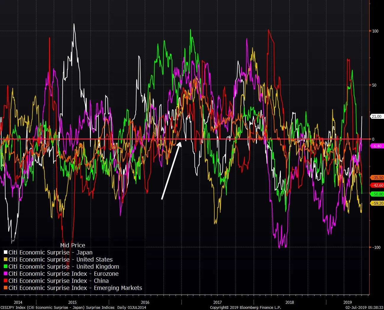 本周充满了经济数据,尽管有7月4日的假期。昨天我们收到了来自世界各地的制造业数据,总体来看情况不佳,尽管美国至少在扩张区间内取得了一个读数。周五我们将获得最新的非农就业数据,这将受到关注,因为上个月仅新增了75,000个工作岗位。这一次,经济学家预计将增加到164,000个,失业率将保持在3.6%。为了更全面地了解情况,我附上了一张全球花旗经济意外指数的图表。对于那些不熟悉的人来说,每条线都是衡量数据相对于经济学家预期的指标。因此,这些线会波动,因为它们自然会回归均值。随着数据恶化,分析师开始削减预期,然后他们削减得过头,数据又开始超出预期,依此类推。我用箭头标出了2016年末的一个时期,那时你可以看到每条线都在零以上,意味着世界各地的经济数据都超出了预测。快进到现在,情况基本上是相反的。几乎每条线都在零以下,只有日本的例外。当然,这些线最终会反弹,但问题是这是否是经济数据改善的结果,还是经济学家意识到他们过于乐观,从而削减了预测。