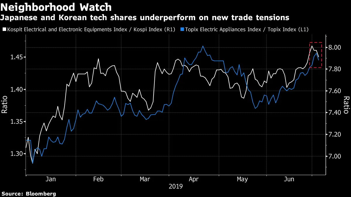 Kospi电气和电子设备指数本周迄今下跌近3%,在周三有关更严格的出口限制可能扩展到其他产品的报道后,大多数日本科技股也加入了下跌行列。虽然没有人准备好宣布即将爆发的亚际贸易战的开始,但投资者显然感到紧张。升级可能促使韩国采取与其每年对日本的芯片出口相关的报复措施,危及供应链,甚至旅游业也可能受到影响,花旗集团表示。交易员们希望这是一起能够迅速得到遏制的贸易争端。