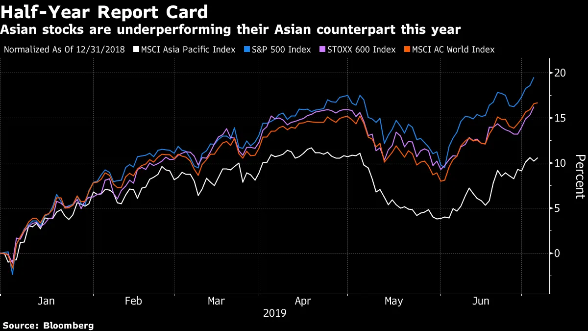 随着2019年上半年的结束,亚洲交易员可以被原谅感到沮丧——该地区明显是全球的落后者。MSCI亚太指数年初至今上涨了11%,表现不及标准普尔500指数近20%的涨幅和欧洲Stoxx 600指数16%的上涨。MSCI全球指数几乎上涨了17%。随着中美贸易战的持续和中国经济增长放缓,投资者已对该地区转身。根据高盛集团周三的一份报告,全球共同基金对亚洲的配置接近十年低点,对冲基金的敞口也保持低迷。