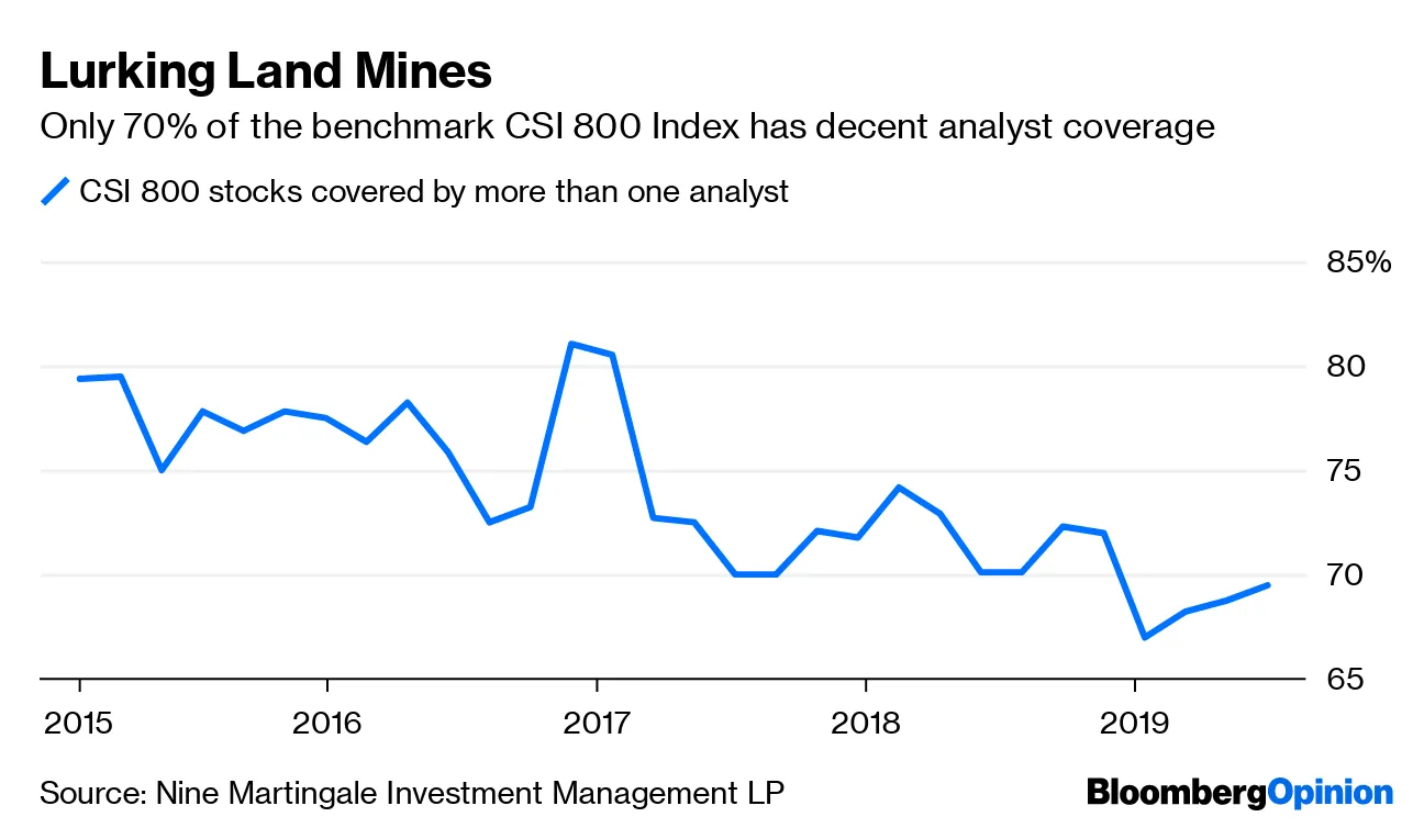 中国股市现在比2015年的惨败更可怕,任舒莉为彭博社观点撰写。上市公司中几乎没有分析师覆盖的数量增加,这对被动投资者构成了 重大风险。这是一个重要的信息传递机制,确保股票不会过度偏离其基本价值。没有它,可能会有另一个汉能潜伏。