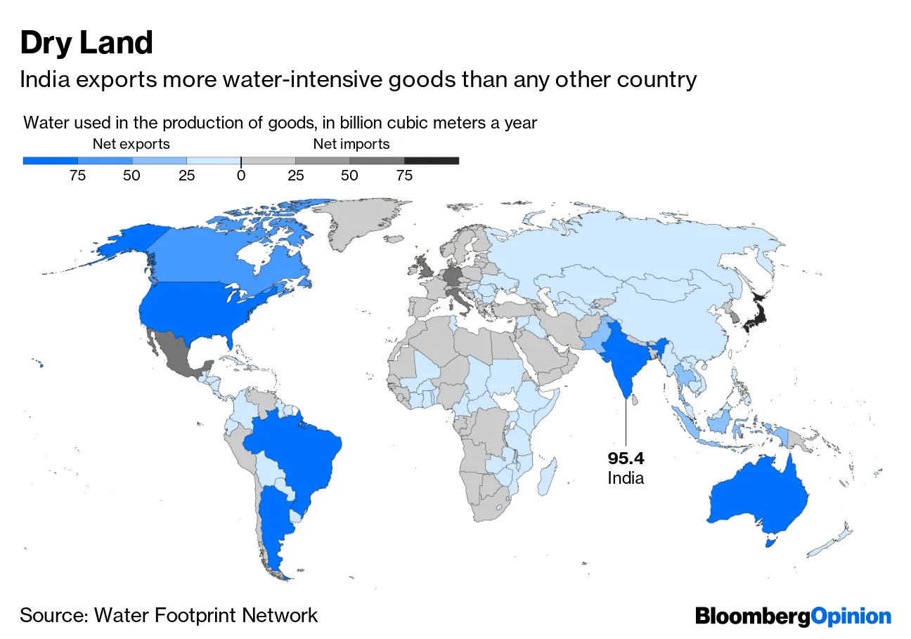 印度正处于水危机之中,但你从 其耗水的农业出口中无法看出这一点,写道 大卫·菲克林,附有 艾琳·赫的图表。
