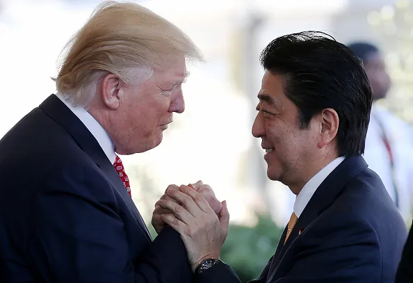 总统唐纳德·特朗普,或许在与日本首相安倍晋三分享贸易战的经验。摄影师:马里奥·塔马/Getty Images 北美### 贸易战,一个新战线