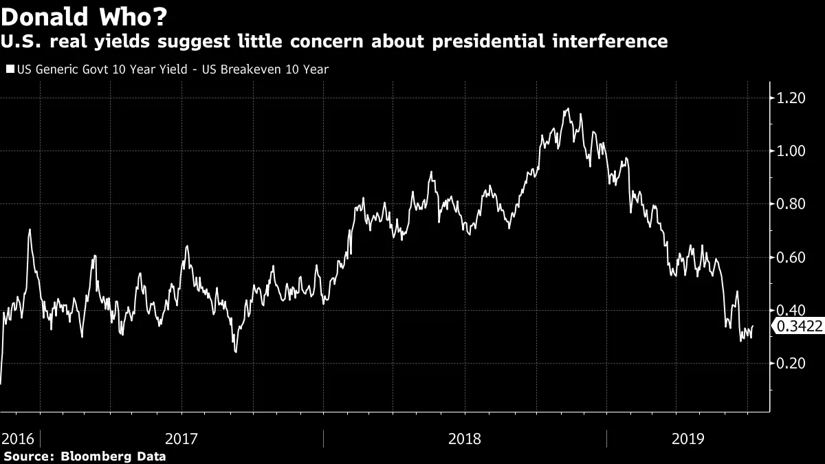 同样,如果债券市场对特朗普对中央银行独立性的粗鲁威胁感到反感,他们的表现方式也很奇怪。这是自选举以来,实际10年期收益率(通过从类似到期国债的收益率中减去10年期 breakeven 利率得出)如何变化的。自特朗普在霸权讲坛上大声喊叫以来,市场状况显著缓解: