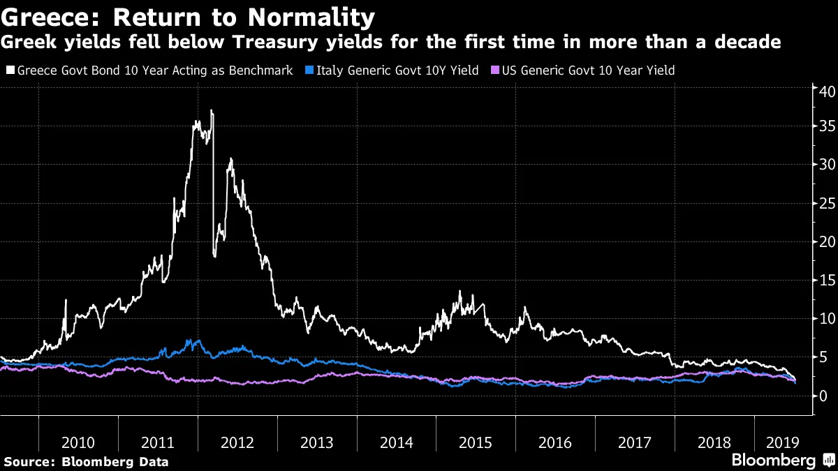 这也使得其债券收益率,长期以来预示着完全的灾难,回归正常。在周一纽约交易的尾声,10年期希腊主权债务的收益率比类似期限的美国国债高出一个基点。这是自2007年以来首次出现这种情况,当时欧元区债券的定价假设所有使用欧元的国家大致上是同样安全的。希腊债务现在几乎与意大利债务的收益率没有差别,这表明现在让投资者担忧的是意大利:
