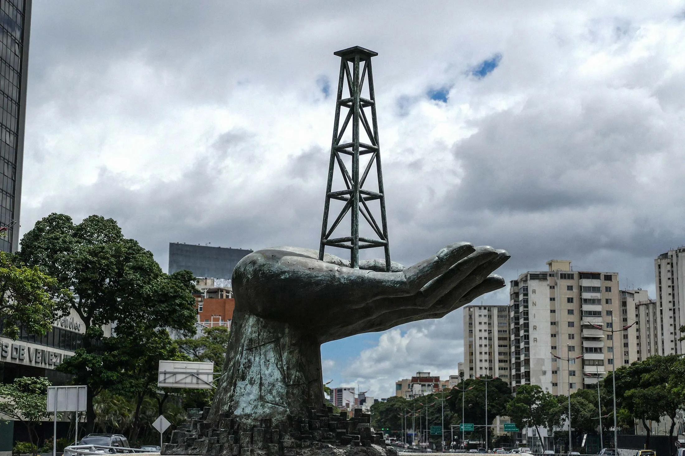 一座描绘油井在手中的雕塑矗立在卡拉卡斯的PDVSA总部外。