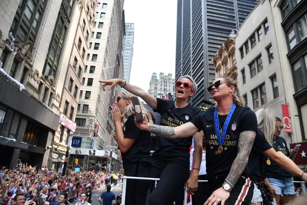 梅根·拉皮诺(C)和美国女子足球队世界杯冠军成员于2019年7月10日在纽约参加女子世界杯冠军的彩带游行。- 在“同工同酬”、“美国”和五彩纸屑的欢呼声中,赢得世界杯的美国女子足球队在周三受到成千上万崇拜者的欢迎,举行了彩带游行。(照片由安吉拉·韦斯/法新社提供)(照片版权应标注安吉拉·韦斯/法新社/盖蒂图片社)摄影师:安吉拉·韦斯/法新社摄影师:安吉拉·韦斯/法新社 通过盖蒂
