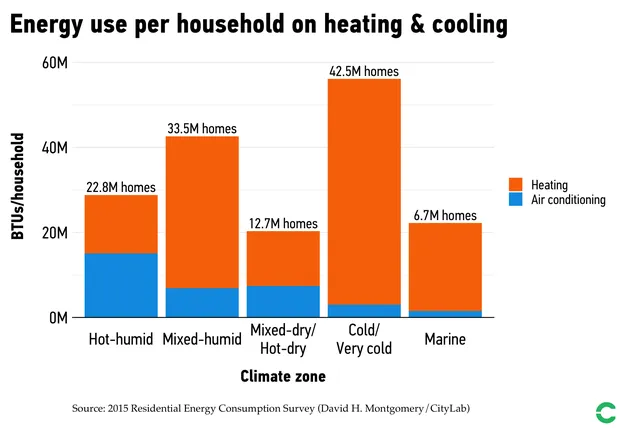 但即使是温暖的城市,供暖所消耗的能量通常也远远超过制冷。在美国能源信息管理局(EIA)跟踪的五个气候区中,空调仅在“热湿”区超过供暖,该区域约占美国家庭的20%。