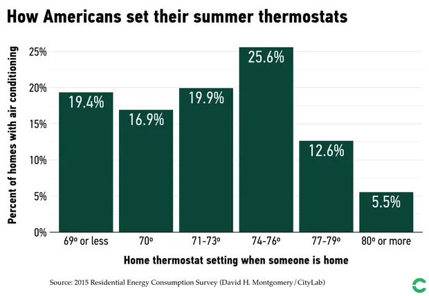 辩论在办公室建筑中最为激烈,因为那里为每个人设定了一个统一的温度,但在美国家庭中也同样存在。大约20%的美国家庭在夏天人们在家时设定温度为华氏69度或更低。另有18%的家庭设定为华氏77度或更高。对于华氏72度和75度的支持者也不在少数,其他地方则是在舒适与成本之间的平衡。