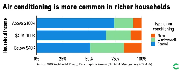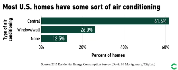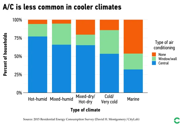 部分原因是,许多寒冷气候的居民根本没有空调。虽然整体上只有约12%的美国家庭没有空调,但在寒冷或干燥的气候中,这一比例上升到15%到20%,而在“海洋”气候中,这一比例接近50%,这种气候在西海岸的许多地方很常见。