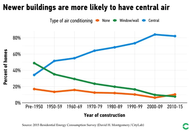 即使是建于空调普及之前的老房子,这一点也依然成立。1950年前建造的房屋缺乏空调的可能性仅比本十年建造的房屋稍高。关键的区别在于,那些老房子更可能依赖窗式或壁挂式空调,而不是中央空调。