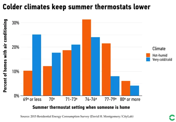 性别并不是影响恒温器设置的唯一因素。生活在寒冷气候中的美国人更倾向于将家中保持凉爽,而生活在炎热地区的居民则更喜欢中等的70多度。目前尚不清楚这在多大程度上反映了经济因素——在外面80度时将家中降温至68度比在外面95度时更便宜——以及生活在温暖气候的居民可能更喜欢温暖的室内温度。