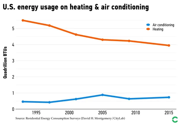然而,供暖与制冷之间的能量差距正在缓慢缩小。美国家庭在空调上的能量消耗比以前更多,而在供暖上的能量消耗则更少。