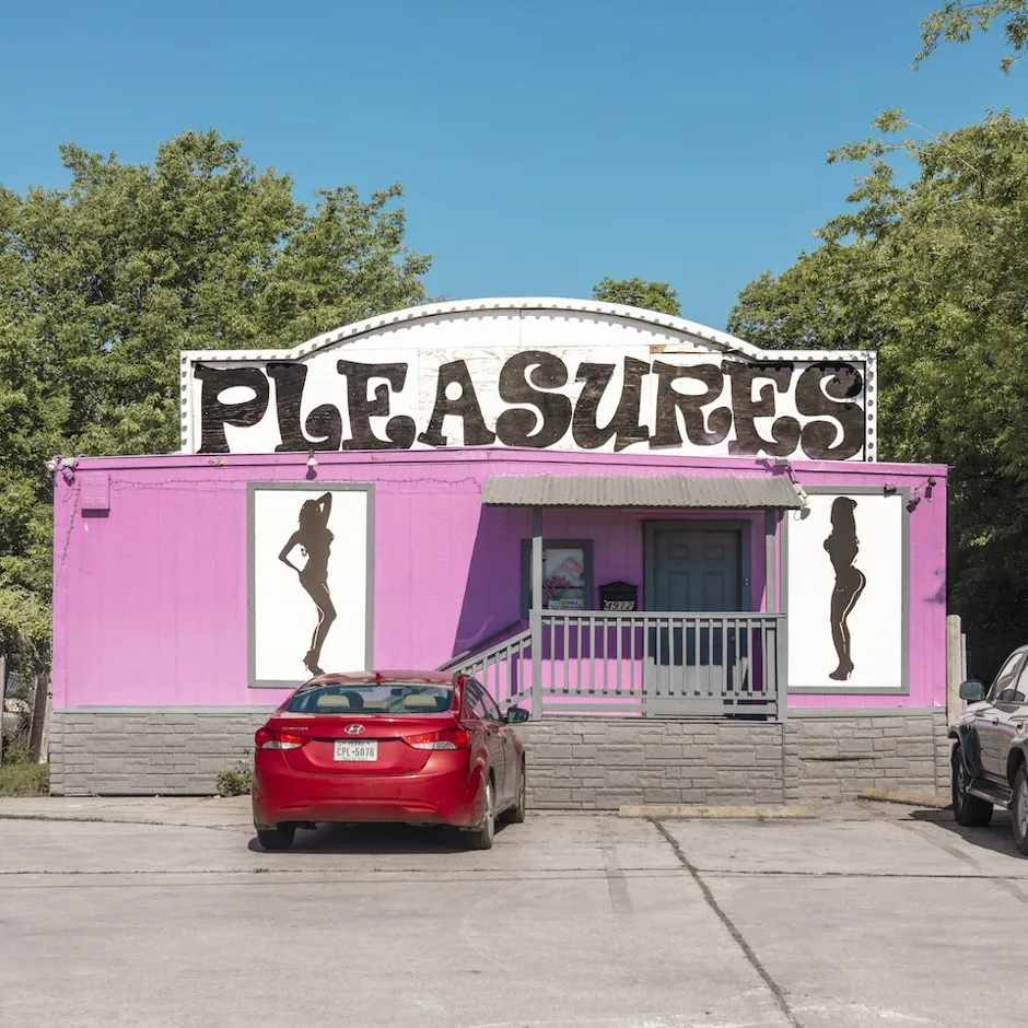 德克萨斯州一家有假窗户和手绘招牌的俱乐部。弗朗索瓦·普罗斯特这种情况常常表现为粉色、红色或紫色的外立面。许多标志和招牌描绘了裸体女性的轮廓,但其他的则简单地包括棕榈树,试图唤起度假目的地的感觉。一些没有窗户的外立面使用了华丽的装饰,类似于“人们可能在主题公园看到的东西,”普罗斯特说,包括一辆怪兽卡车、一只霓虹马提尼酒杯和古典柱子。