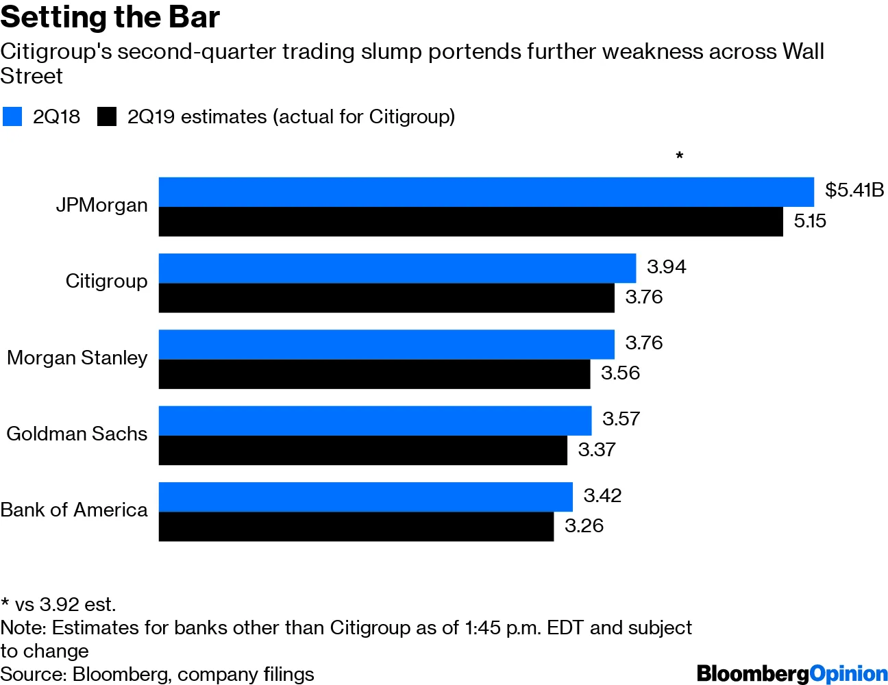 花旗银行开启了一周的银行财报,承诺继续削减成本。它的削减超过了分析师的预期,消费者部门发布了自2013年以来最强劲的第二季度业绩。综合来看,这帮助抵消了公司在华尔街的运营,交易员们面临困难——尤其是那些处理利率产品的交易员。交易收入已经连续三个季度下降;这一次,下降了大约5%。