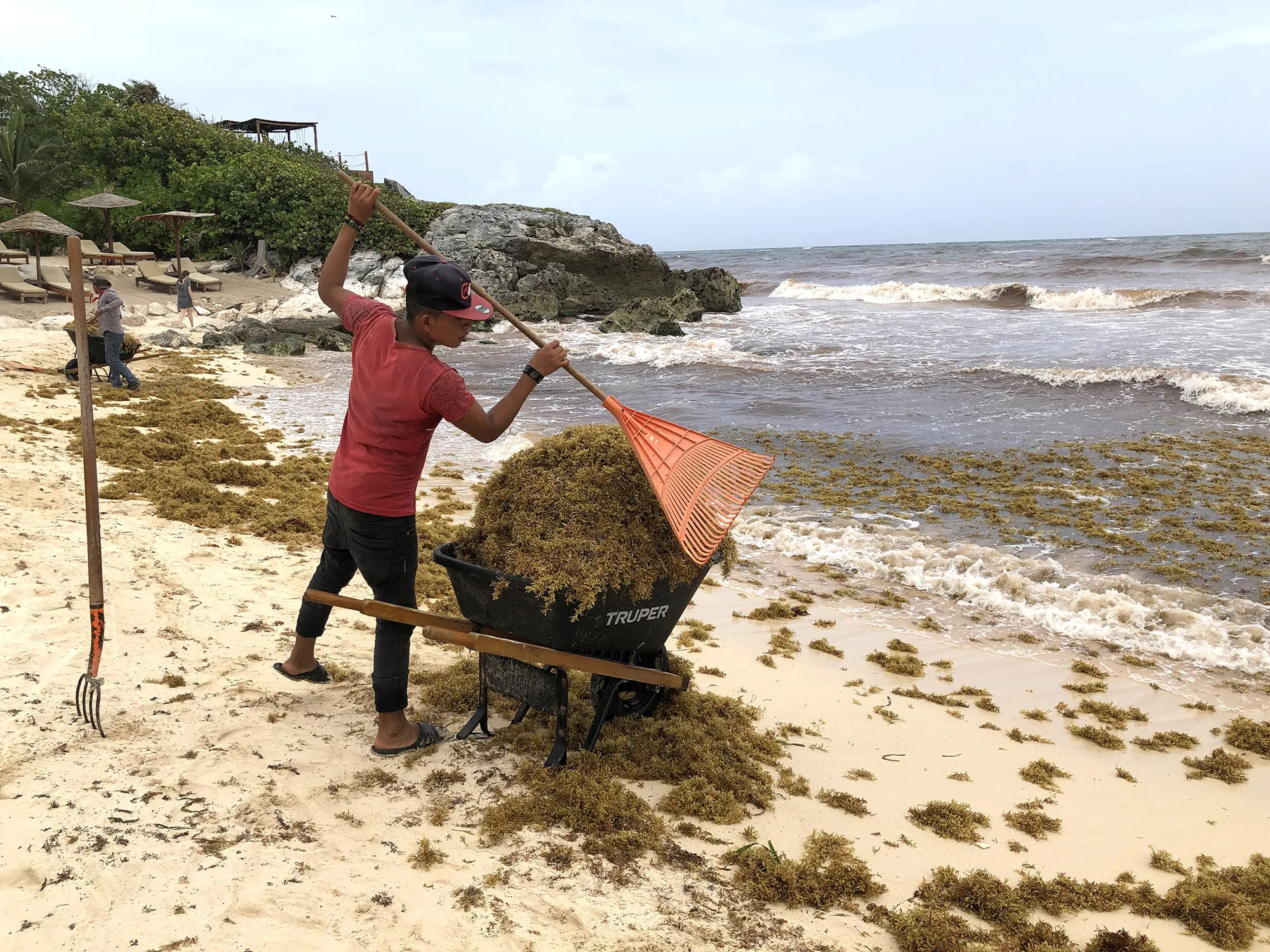一名工人使用耙子在2019年6月15日于图卢姆的海滩上清理海藻状的藻类——浮萍。摄影师:贾斯廷·沙利文/盖蒂图片社在图卢姆的海滩上耙起浮萍的堆积物。 摄影师:贾斯廷·沙利文/盖蒂图片社
