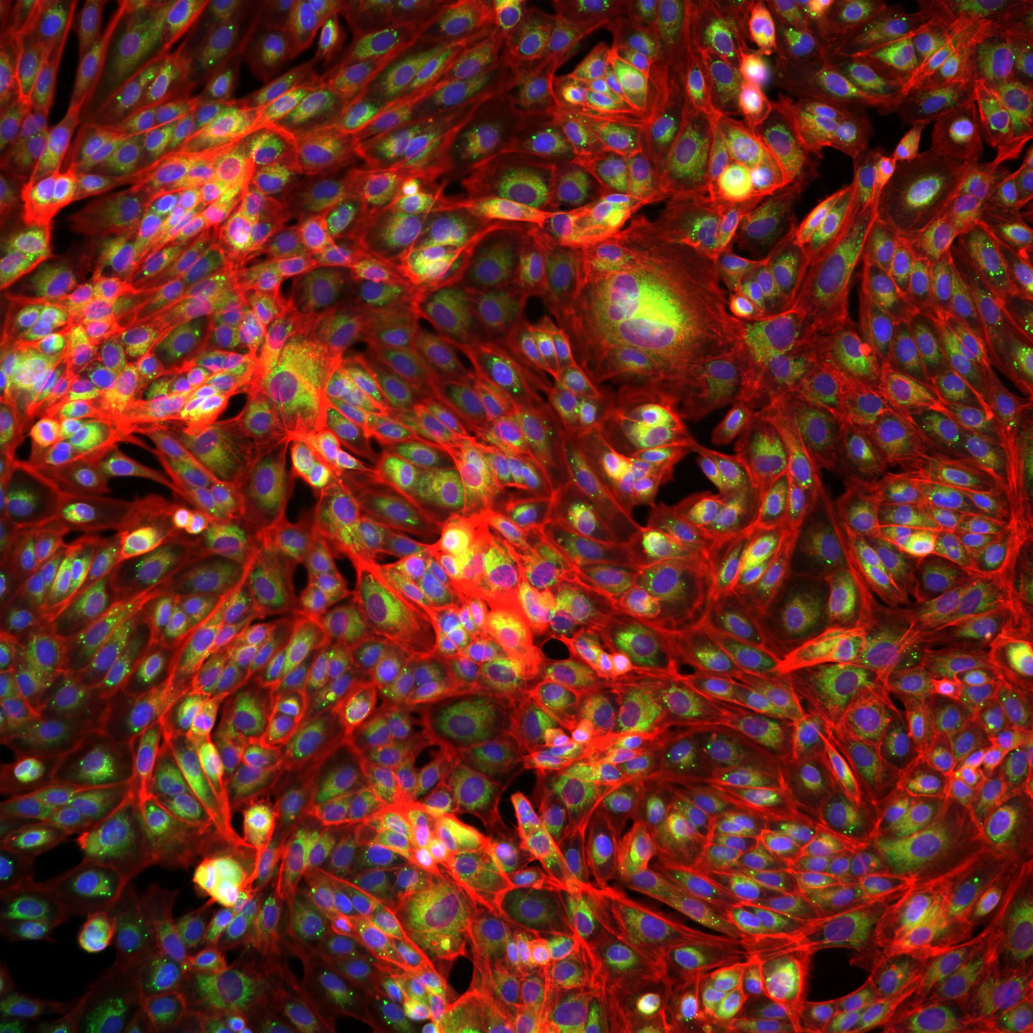 人类肾脏细胞用于在Recursion的平台上建模疾病。来源:Recursion制药公司人工智能可以用于扫描数百万张高分辨率的细胞图像——这是人类无法独自处理的——以识别能够以意想不到的方式使病变细胞更健康的疗法。