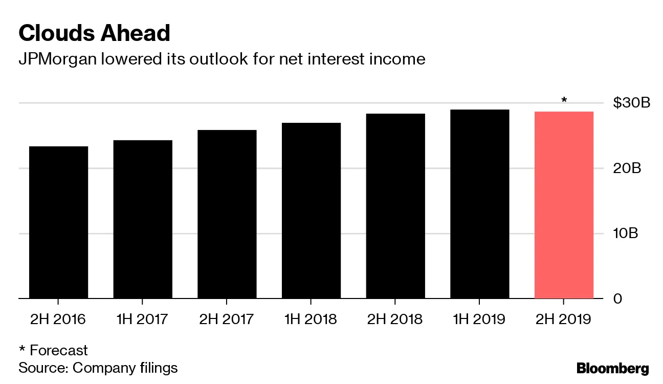 - 摩根大通打破了 净利息收入连续三年的季度增长——客户贷款支付的收入减去银行支付给存款人的利息——并表示在2019年下半年将 进一步下降。富国银行的贷款收入创下自2016年以来的最低,而花旗集团的净利息差则降至五个季度以来的最低。