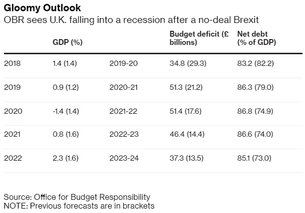 - 财政监管机构发出严峻警告:无协议脱欧可能使经济陷入衰退,打击英镑和房价,并使政府借款增加数百亿英镑。以下是预算责任办公室的分析。