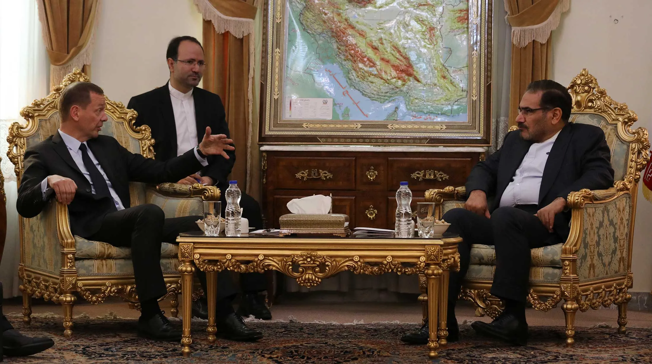 埃马纽埃尔·博恩,左,正在与伊朗国家安全委员会秘书阿里·沙姆哈尼会面。