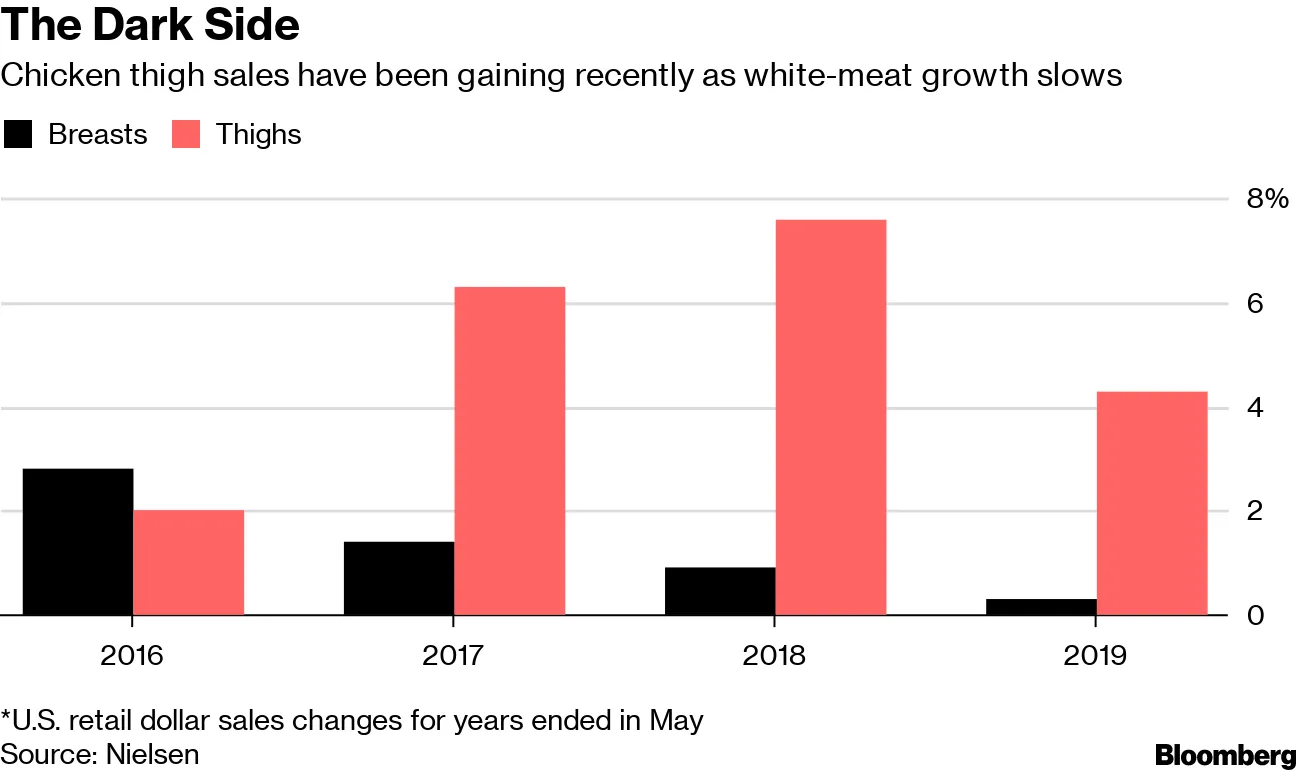 **大腿肉需求旺盛:**美国人终于对鸡胸肉感到厌倦。过去十年,美国大腿肉的零售销售增长了九倍,餐馆的采购量也在增加,泰森食品表示,随着消费者口味的变化,他们寻求更多拉丁、印度和东亚菜肴,这些菜肴通常以深色肉鸡肉为主。历史上,大腿肉对节俭的购物者更具吸引力。现在吸引人的因素是风味和易于准备。“这是一种更好的用餐体验,”普渡食品的首席营销官埃里克·克里斯蒂安森说。“搞砸大腿肉是非常困难的。”