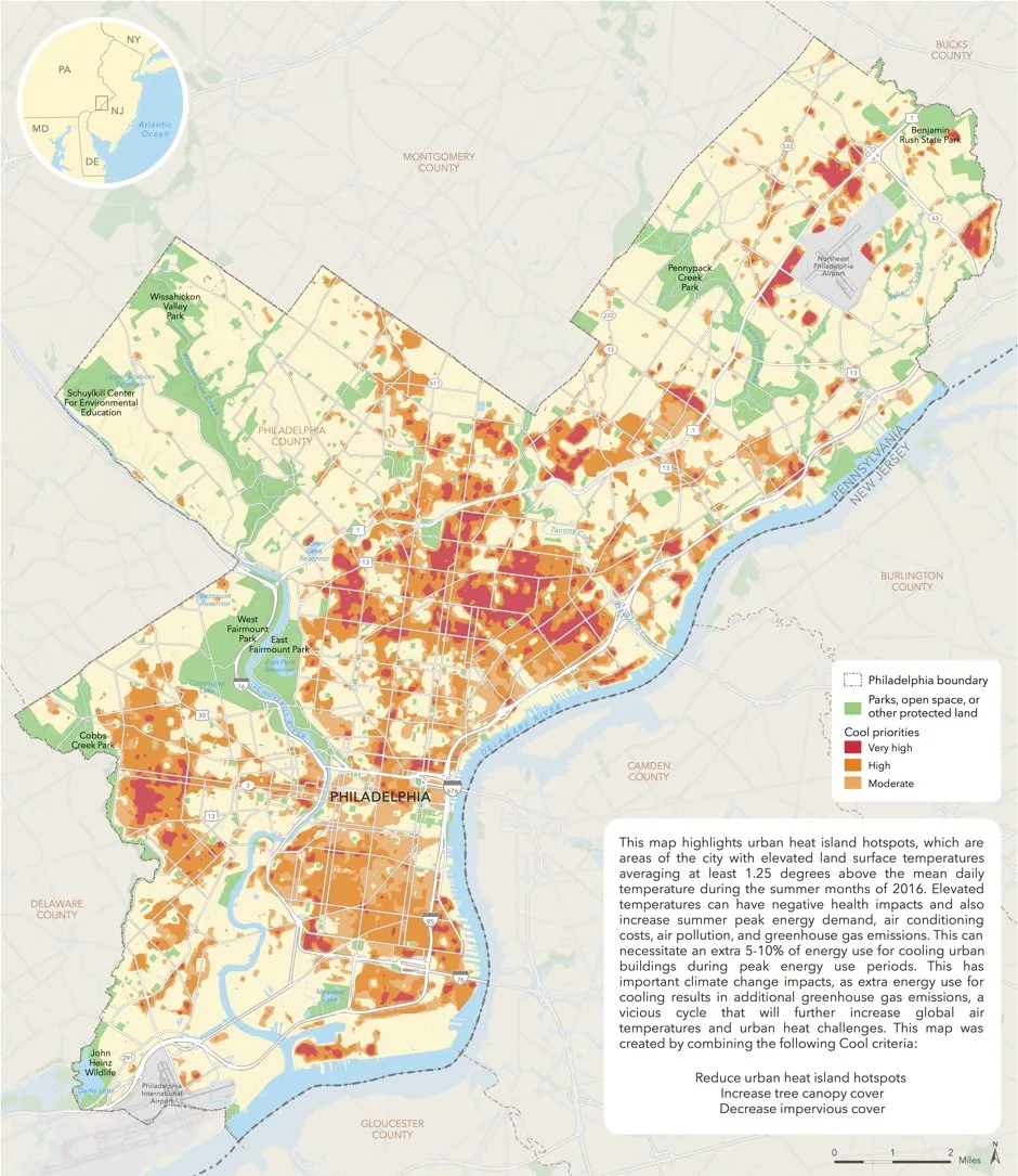 根据2017年的数据,费城的城市热点。公共土地信托费城和许多邻近城市一样,正处于过度高温警告中,气温徘徊在100华氏度左右,热指数值在这个周末达到115华氏度。热点包括南费城,那里的砖房在“混凝土棋盘”中延伸数英里。仓库区在2017年公共土地信托的热点地图上也显示出更高的温度,周围有大型停车场的区域,如城市的体育场,也同样如此。