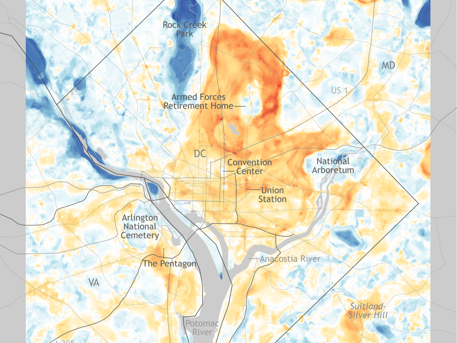 最热的地方离一些最凉的地方也不远:位于大型高尔夫球场附近的武装部队退休之家,似乎是一个相对凉爽的岛屿,周围是一片热浪。而在这一切的西边是洛克溪公园,一个相对的绿洲,低海拔和茂密的树木——它的温度与波托马克河沿岸的绿树成荫、低洼地区相似。