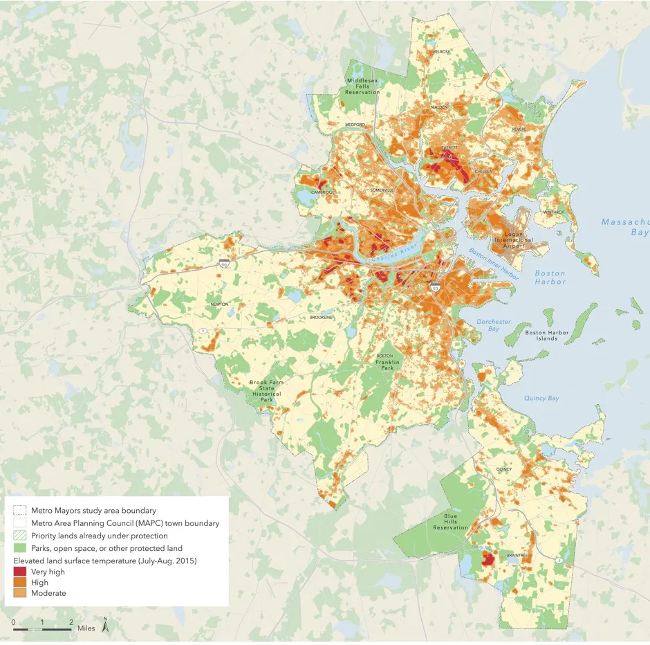 基于2015年数据的波士顿城市热点。公共土地信托国家海洋和大气管理局的城市热映射项目正在利用这个炎热的周末为波士顿和剑桥制作自己的热岛地图。志愿者将遍布该地区,回响已经为华盛顿特区、巴尔的摩和里士满所做的工作,如果周六的温度达到100华氏度,他们将在创纪录的一天记录热岛。(根据 波士顿杂志Boston Magazine*,*自1872年开始记录以来,波士顿仅记录过25次三位数的温度。)