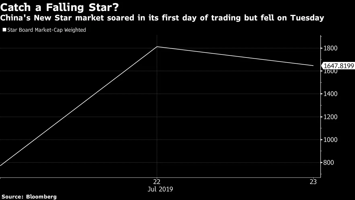 中国股市的大新闻是星辰板的推出——这是该国新的纳斯达克风格的科技股交易场所。星期一是交易的第一天,立即看到25只新上市的股票平均上涨了140%(这种价格波动帮助创造了三位新亿万富翁)。许多分析师一直在谈论星辰市场上股票的波动性和高估值。例如,Acroguardian Investment Co.的曲少华表示:“即使是扩张速度最快的最佳公司也不值得这种估值,并且没有真正的理由相信这些公司的质量优于主板。”