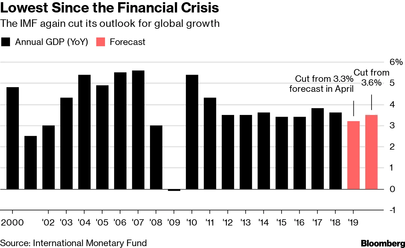 国际货币基金组织进一步下调 其全球增长预测,已经是自金融危机以来的最低水平,并暗示 政策“失误” 在贸易和英国脱欧方面可能会影响预期的反弹。该基金表示,全球经济今年将增长3.2%,明年将增长3.5%。3.3%或更低的增长率将是自2009年以来的最低水平。